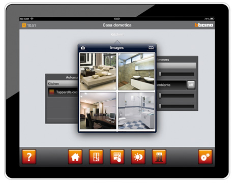 L’applicazione consente di visualizzare diverse immagini per gli sfondi personalizzati di ogni locale (la cucina, l’ingresso, il garage…), prelevandole da una libreria standard precaricata oppure dalla libreria personale dell’utilizzatore. Il cliente può dunque caricare le immagini dei vari locali della propria abitazione e usarli come sfondo delle relative videate.