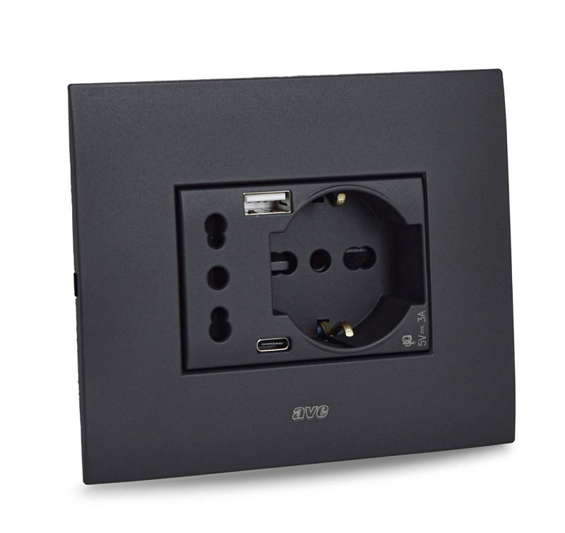 Si tratta di una soluzione in linea con l’evoluzione dell’abitare: il monoblocco AVE include infatti le due prese più installate negli impianti elettrici (presa bipasso per spine da 10A e 16A e presa schuko) e può offrire entrambi gli standard USB oggi più richiesti, l’attuale tipo A e il tipo C, lo standard per il futuro. Tutte le prese del monoblocco AVE possono essere adoperate contemporaneamente così da incontrare al meglio le esigenze dei clienti finali.