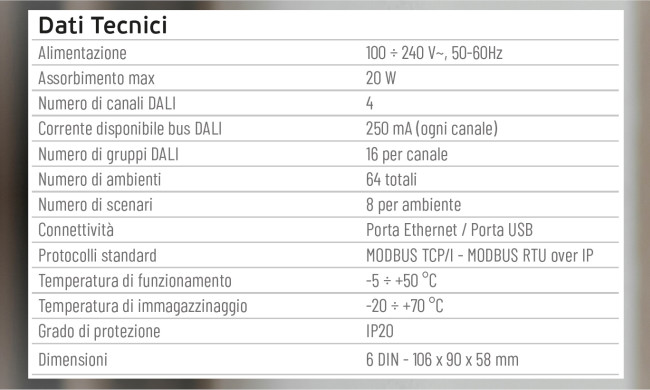 - Supporto per 16 gruppi DALI per ogni canale DALI, consentendo una gestione dettagliata e puntuale degli apparecchi illuminanti.