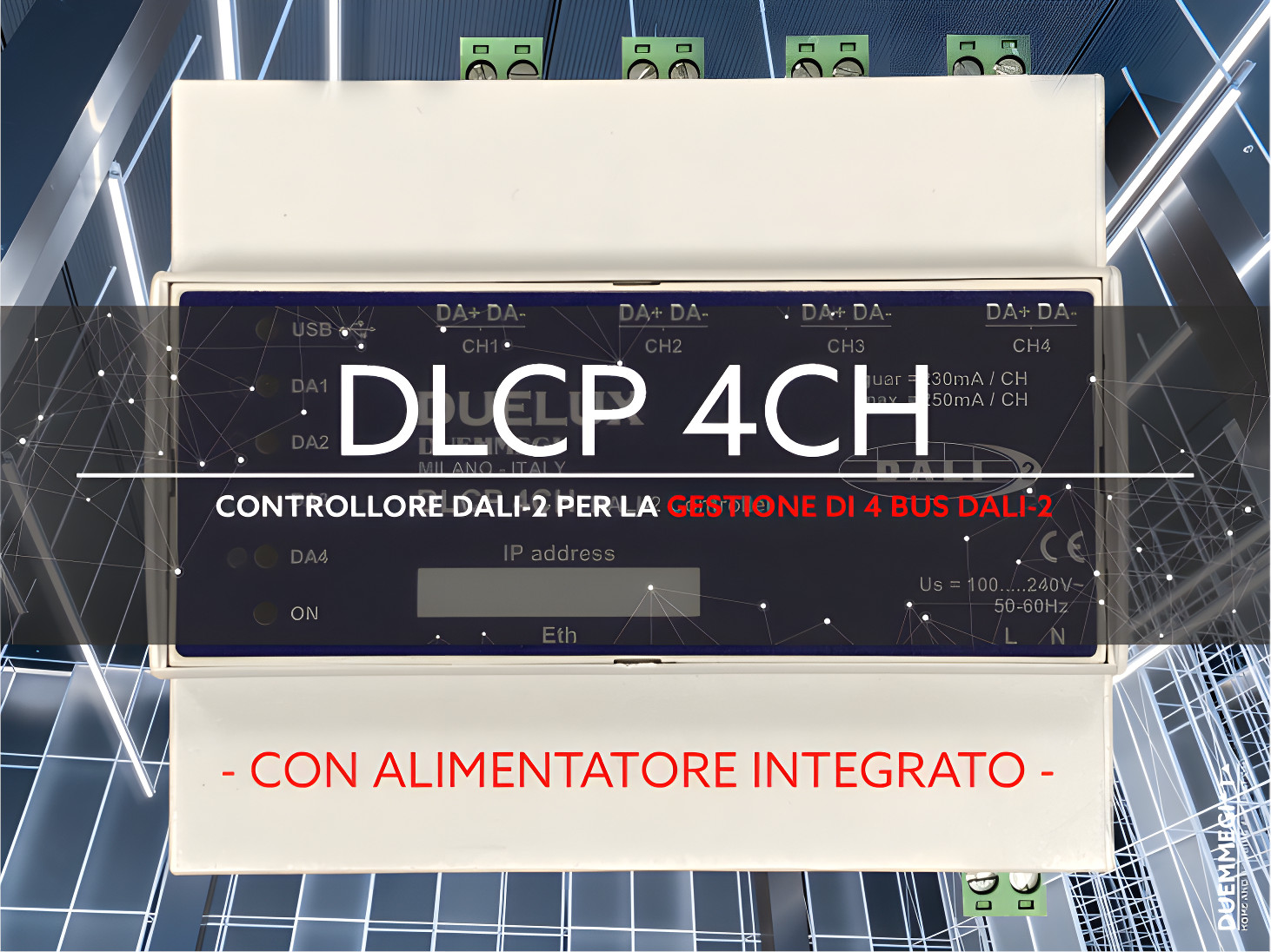 Con una combinazione di funzionalità avanzate, facilità d’uso e supporto per le ultime innovazioni nel campo dell’illuminazione, il DLCP 4CH si pone come il nuovo standard per la gestione degli impianti e rappresenta una soluzione all’avanguardia per la gestione degli impianti mediante tecnologia DALI-2.