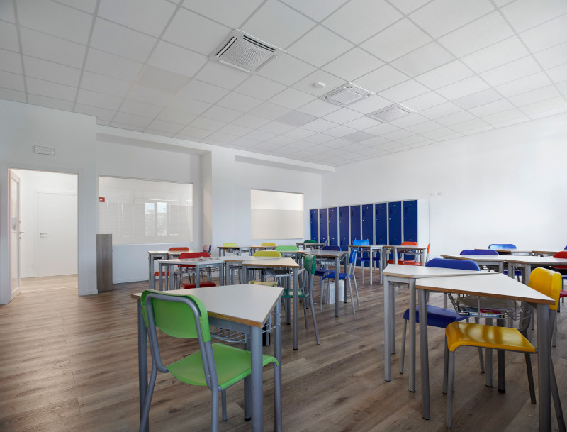 L’intervento ha consentito di ottimizzare l’efficienza energetica dell’edificio scolastico attraverso l’adozione del sistema WEOZ, una piattaforma innovativa di gestione e supervisione per il terziario capace di connettere e controllare illuminazione, temperatura, qualità dell’aria e consumi energetici.