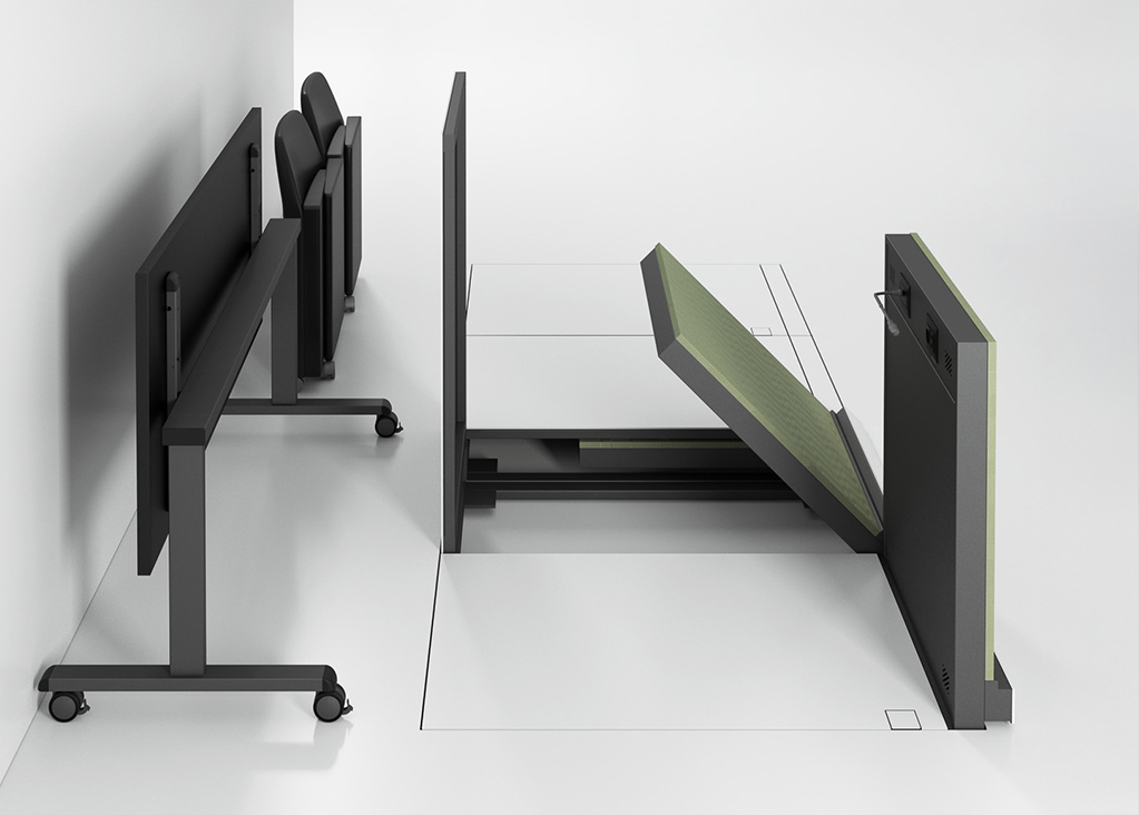 La struttura interna è progettata per ospitare apparecchiature audio-video e dispositivi ICT, inclusi endpoint AV over IP su rame o fibra. Il sistema di pre-cablaggio integrato elimina la necessità di collegamenti manuali in fase di apertura o chiusura, proteggendo la tecnologia interna e garantendo prestazioni costanti nel tempo.